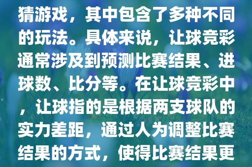 世界杯让球竞彩是一种足球竞猜游戏,其中包含了多种不同的玩法。具体来说,让球竞彩通常涉及到预测比赛结果、进球数、比分等。在让球竞彩中,让球指的是根据两支球队的实力差距,通过人为调整比赛结果的方式,使得比赛结果更具悬念和公平性。