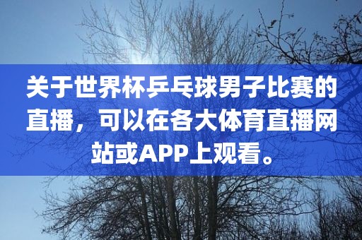 关于世界杯乒乓球男子比赛的直播,可以在各大体育直播网站或APP上观看。